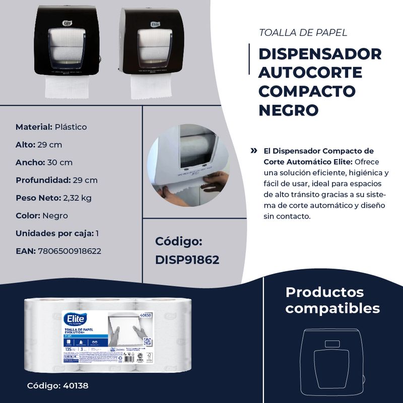 Dispensador Toalla Autocorte Compacto Negro 1 Un Elite Professional